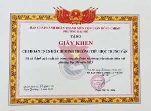Sáng nay, ngày 23/12/2025, tại Hội nghị Tổng kết công tác năm 2025, triển khai nhiệm vụ năm 2026; Phát động phong trào thi đua năm 2026; Biểu dương các tập thể, cá nhân có thành tích xuất sắc năm 2025 của Đảng bộ phường Đại Mỗ, chi bộ trường tiểu học Trung Văn đã vinh dự nhận Giấy khen Chi bộ đạt tiêu chuẩn “Hoàn thành xuất sắc nhiệm vụ” tiêu biểu năm 2025.